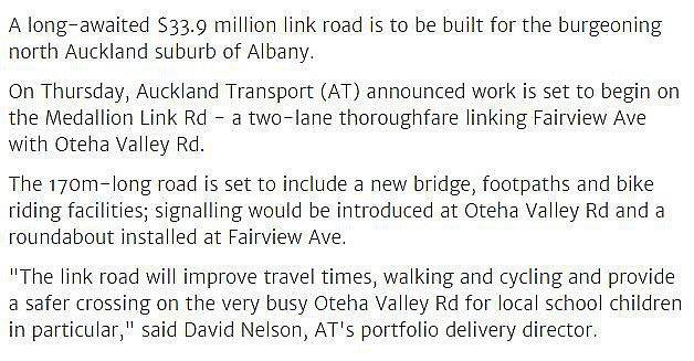 New funding approved for a new link road between Gills Road and Oteha Valley Road, with estimated start in December this year and improvements to Cycleways, walkways, and playgrounds will benefit the central convenience on your property.