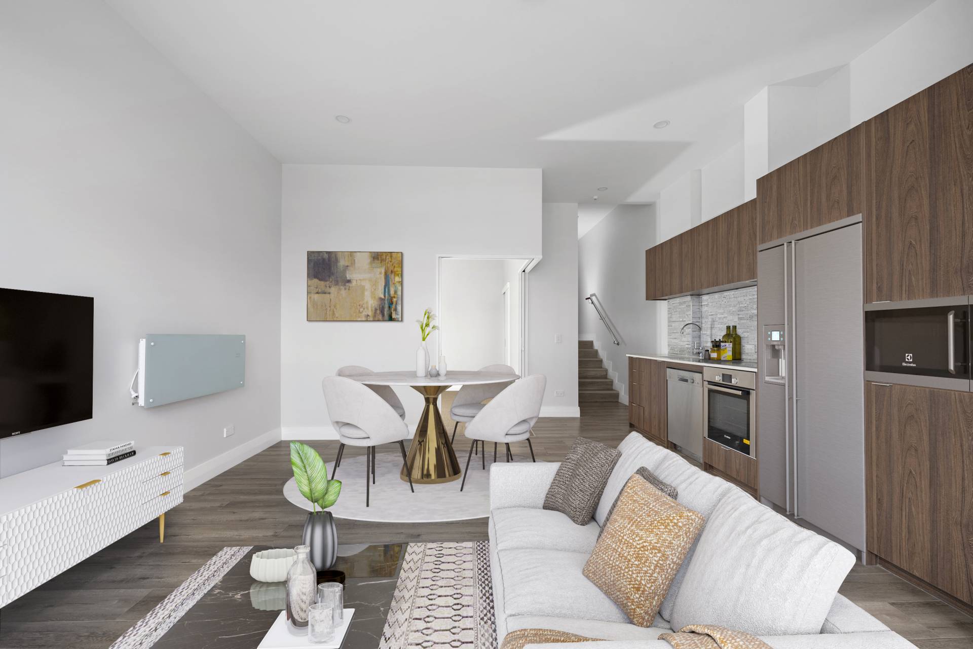 Step inside and be greeted by the contemporary design and stylish interiors. The open floor plan seamlessly connects the living, dining, and kitchen areas, creating a spacious and inviting atmosphere. The hardwood flooring adds a touch of elegance, while the large windows flood the space with natural light, creating a warm and welcoming ambiance.