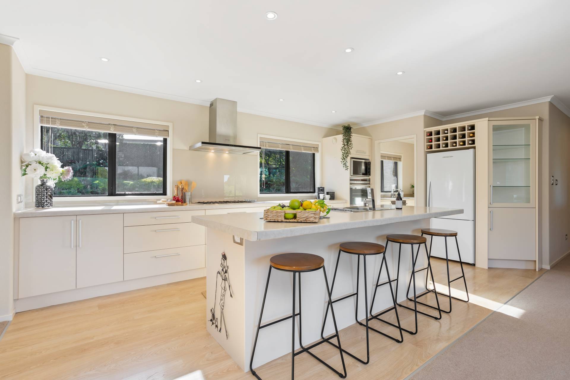 Step inside and be captivated by the spacious 317m2 floor area, the west wing features a spacious family room, dining room, and expansive lounge with wide opening ranch sliders in both rooms, leading to a wrap around patio and beautifully landscaped gardens. The modern large kitchen features an island benchtop that serves the open plan dining area, while the large butlers pantry with a second sink adds extra convenience for the food preparation.