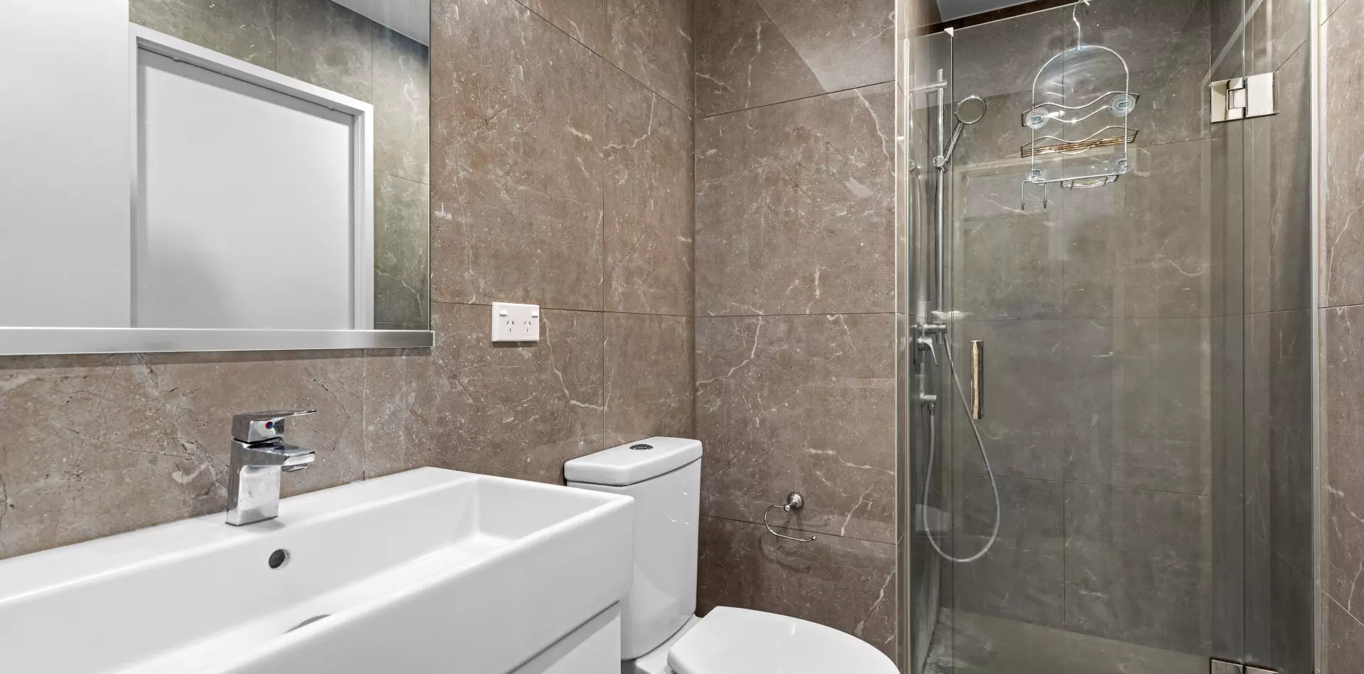 • Designer bathroom with full floor-to-ceiling tiling