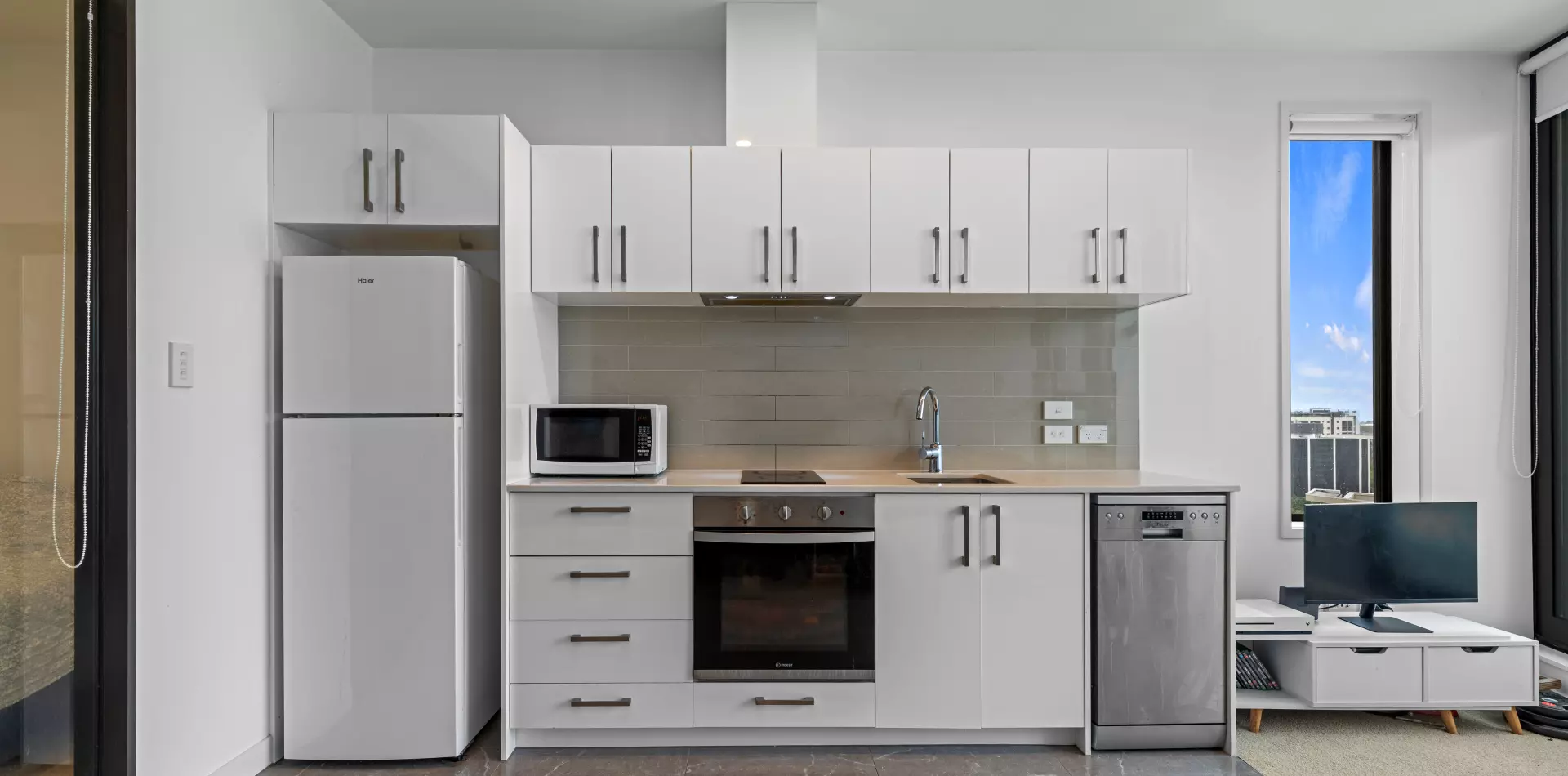 • Modern kitchen with European appliances, tiled flooring and splash backs