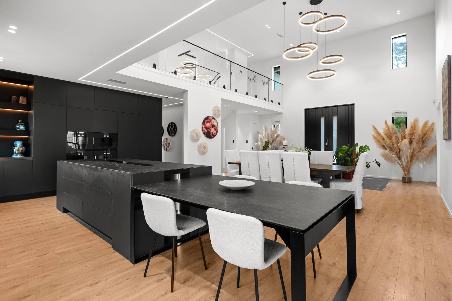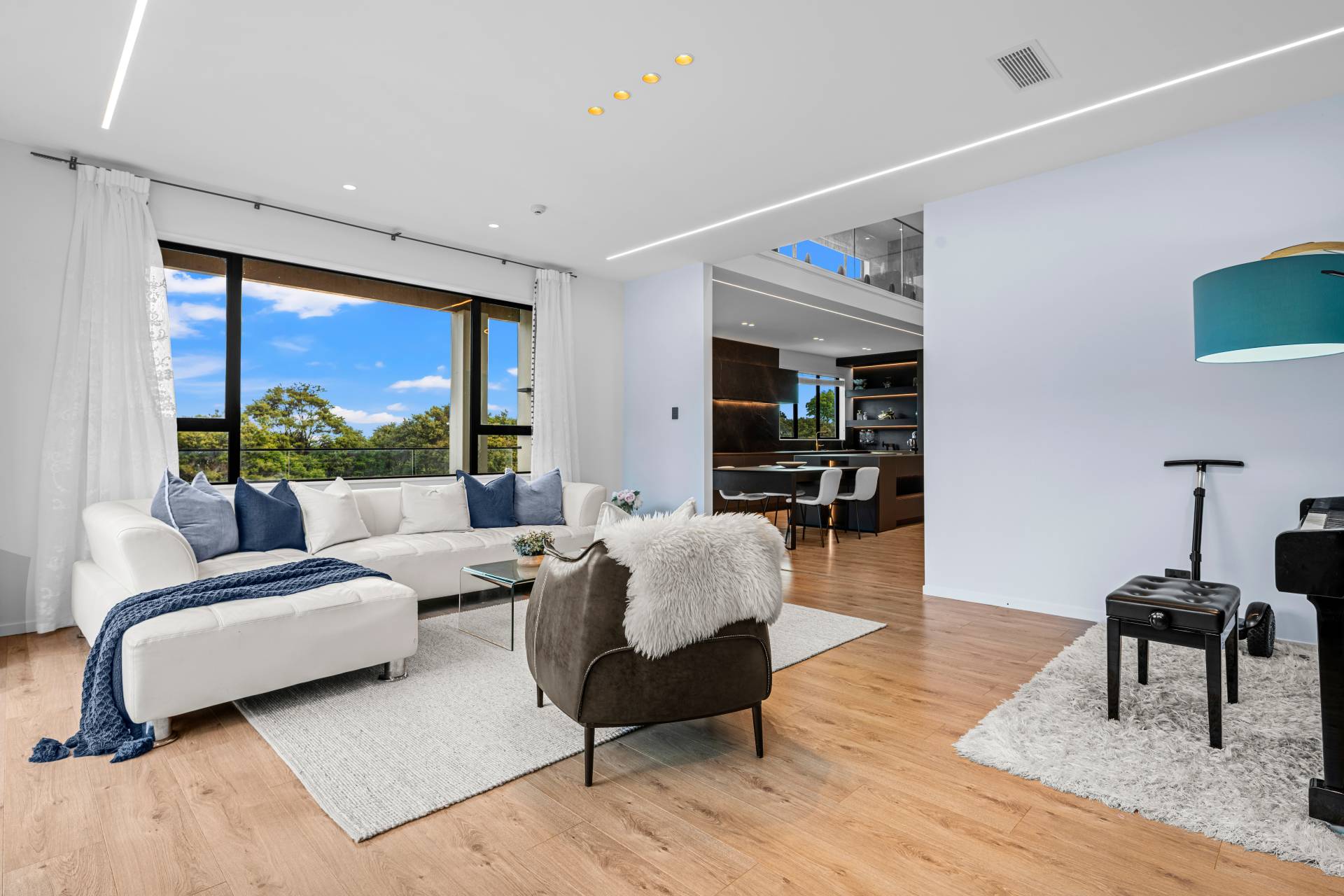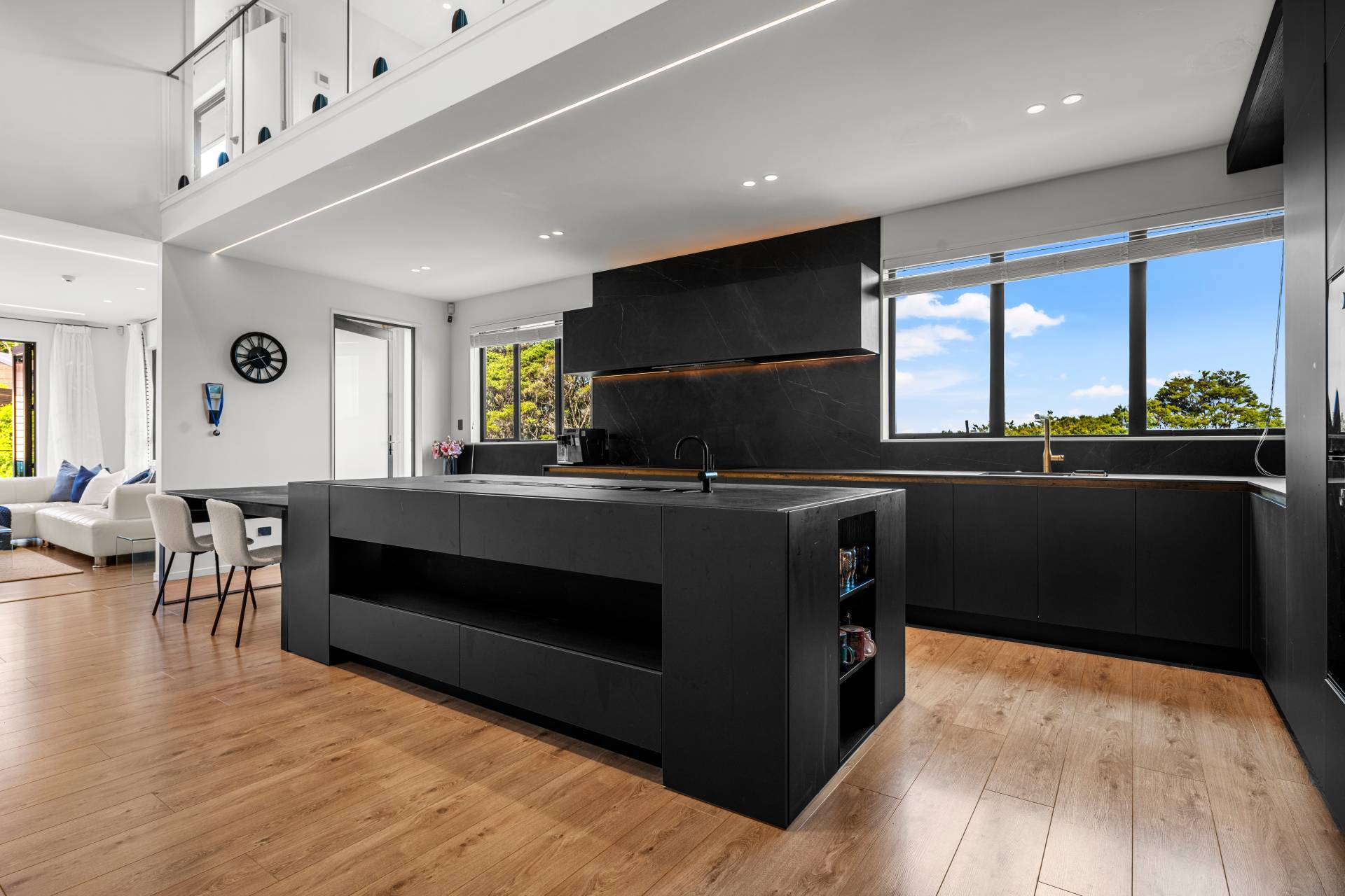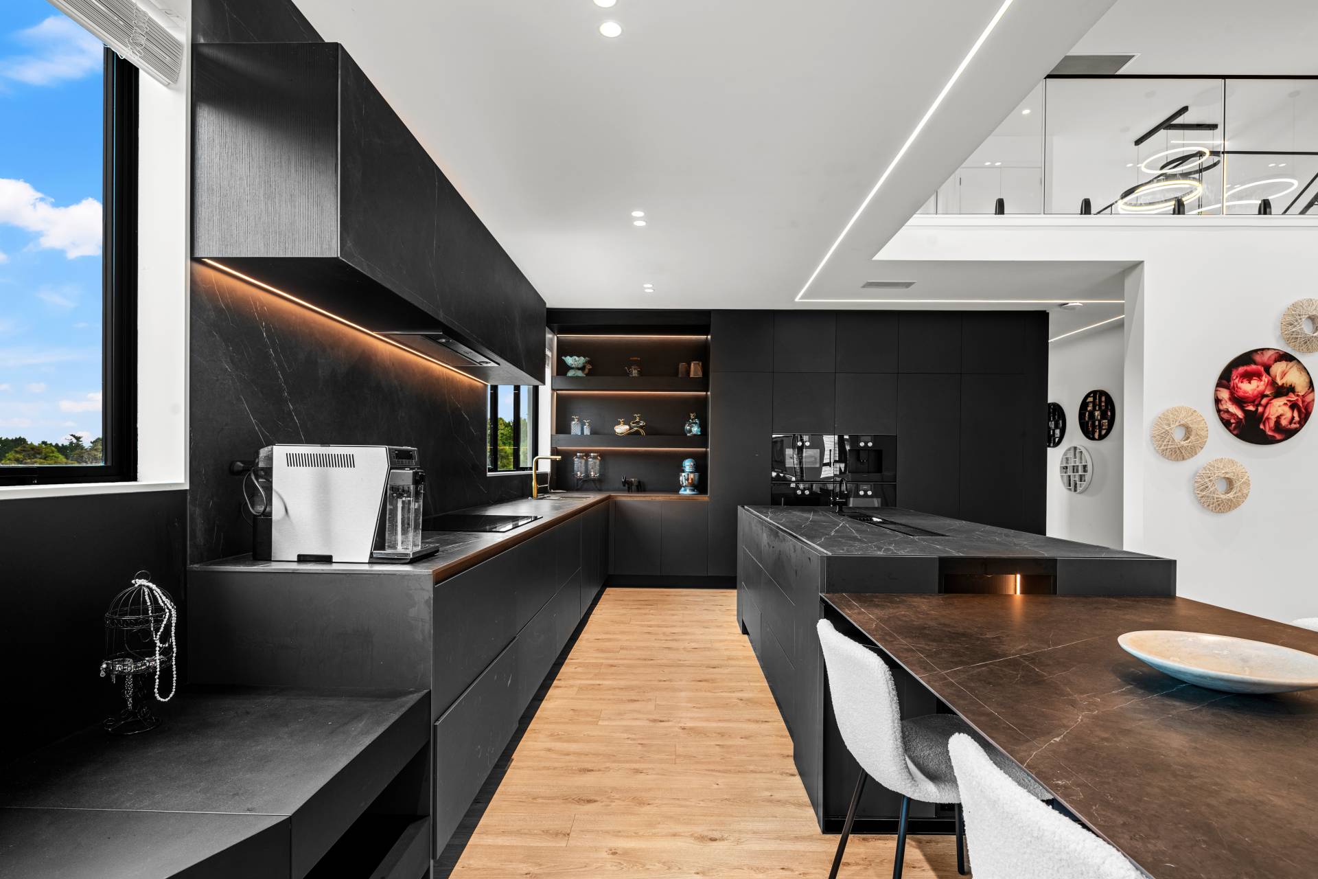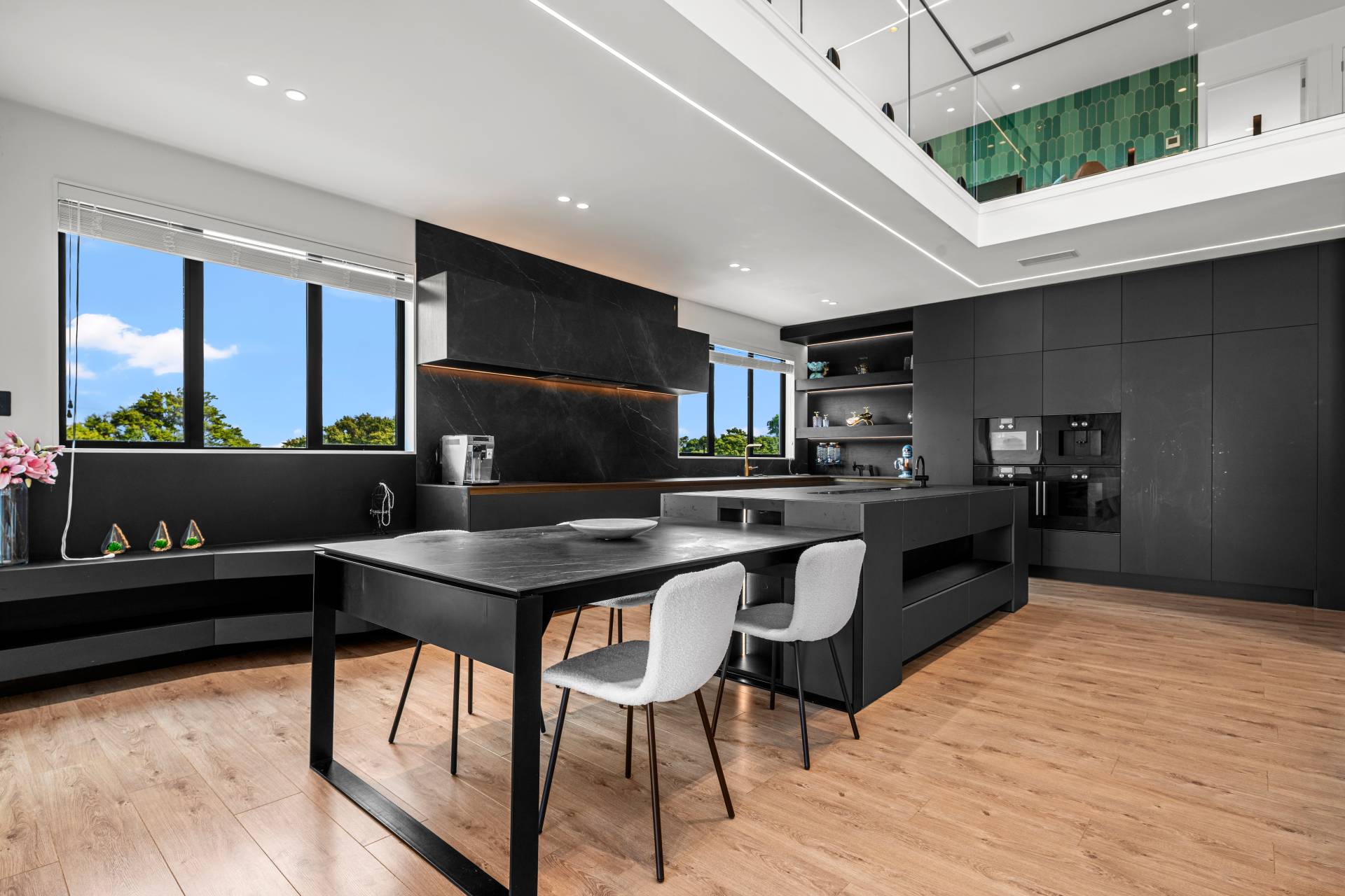 At its heart, Italian-inspired kitchens feature full Gaggenau specification, sintered stone surfaces, a dedicated gas kitchen and butler's servery, all anchored by a dramatic high-ceiling living, dining and kitchen domain where natural light floods in, creating a sense of openness and architectural presence.