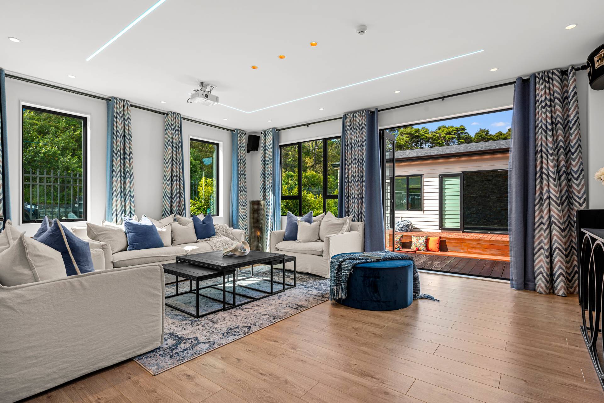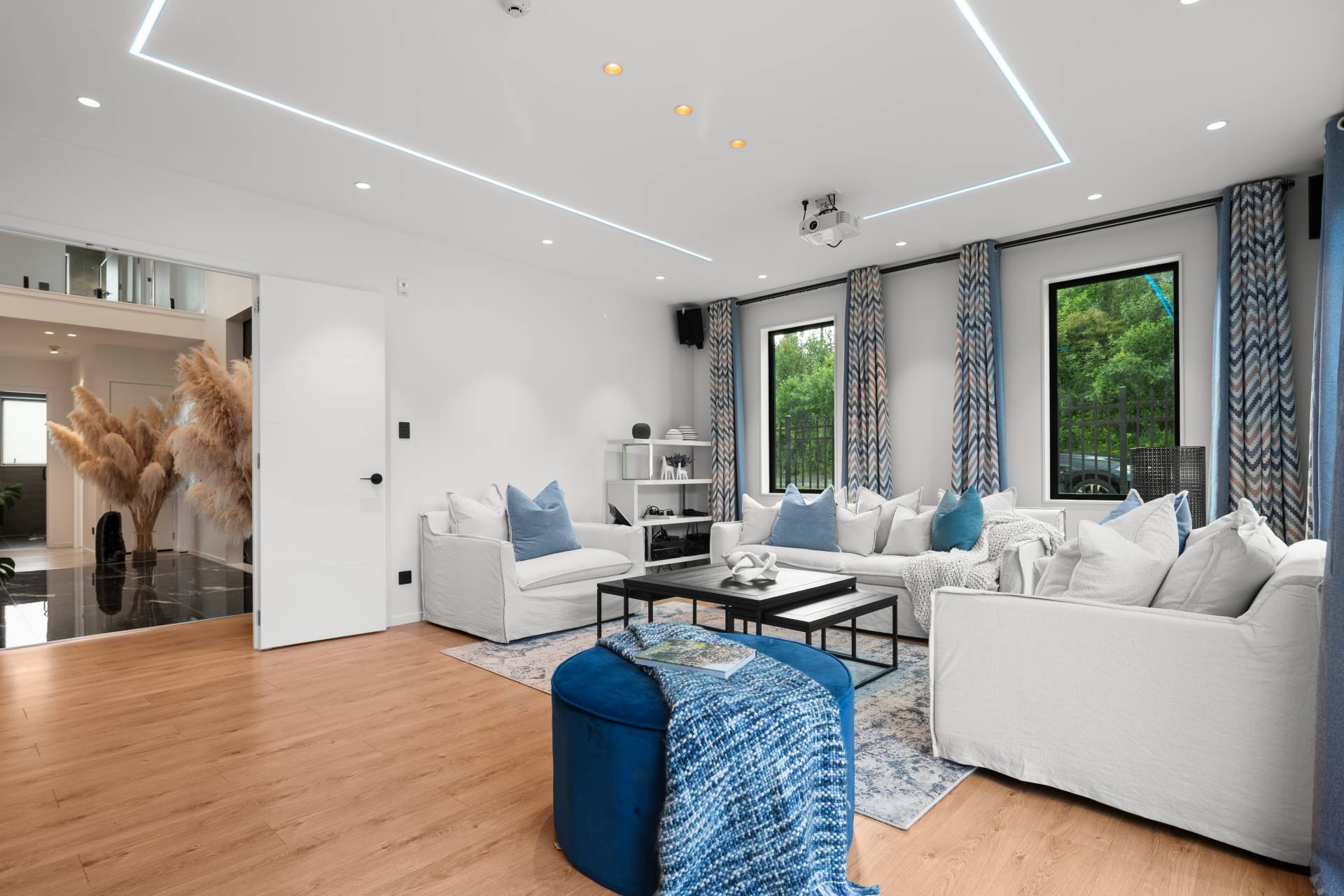 Designer lighting, bespoke storage and multiple living and work-from-home spaces ensure comfort without compromise. A four-car garage completes the offering, featuring a dedicated gym area nad extensive storage.